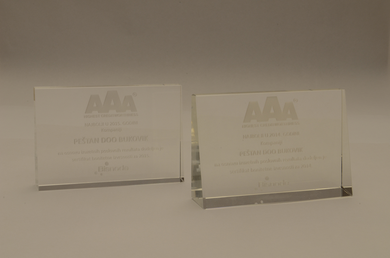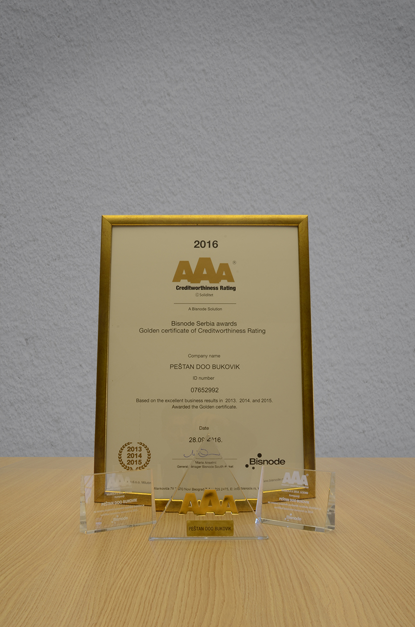 佩斯塔納三年連續(xù)載波最高等級的卓越企業(yè) - AAA和卓越因而當(dāng)之無愧的信貸持有人GOLD證書,證明是最成功的公司在塞爾維亞和地區(qū)之一。