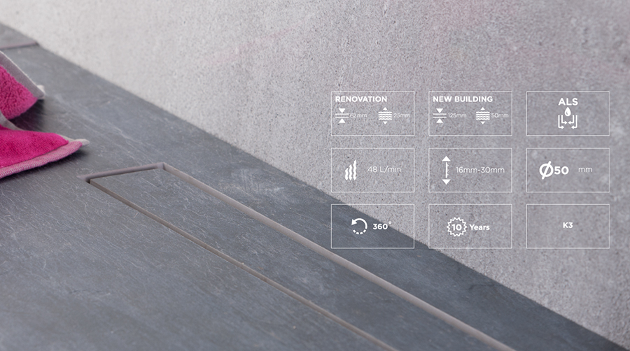 防滲漏: 由于支撐格柵的全新設(shè)計和瓷磚下泄露所有的冷凝水發(fā)現(xiàn)其放回排水方式。通過附帶的產(chǎn)品自粘防水膠帶補充。