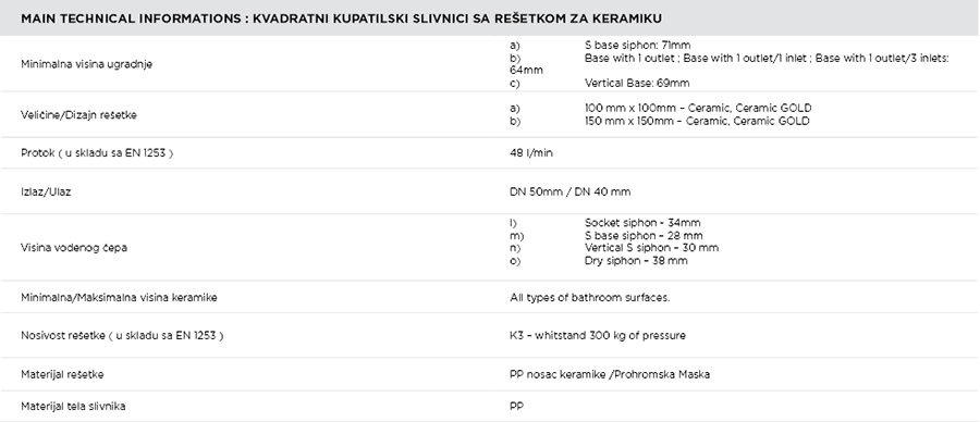 Peštan公司其Confluo標(biāo)準(zhǔn) - 浴室地漏與光柵為不同大?。?00毫米x 100在100mm和150毫米×150毫米),爐篦(陶瓷和陶瓷金),6種不同的堿(用1個(gè)輸出水平基座的不同設(shè)計(jì)的2,水平基座的陶瓷產(chǎn)品2用1次1的輸入/ 1輸出,水平基座3輸入/ 1輸出,其基極為40mm水柱,其基極用30mM水溶液塞子,垂直堿)和3種不同類型虹吸(虹吸在基于S-,干虹吸帽密封的)所有堿基Confluo標(biāo)準(zhǔn)模型具有DN和DN輸出50毫米40毫米盡可能多的48升/分鐘的流速進(jìn)入。從74毫米最低高度毫米到95毫米視型號(hào)而定。