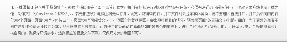 下載--店招門頭規(guī)范,縱橫版標準,工藝:以彩色鋁塑板為主,字以白色雪弗板雕刻字;特別要求可制作發(fā)光字,內發(fā)光字、LED字、吸塑發(fā)光字。其次為內打燈箱噴繪布 + 5CM不朽鋼包邊。紅色標準色值為:C15-MY100,PANTONE 711C;備注,注意顏色配比色值;格式:cdr12; |